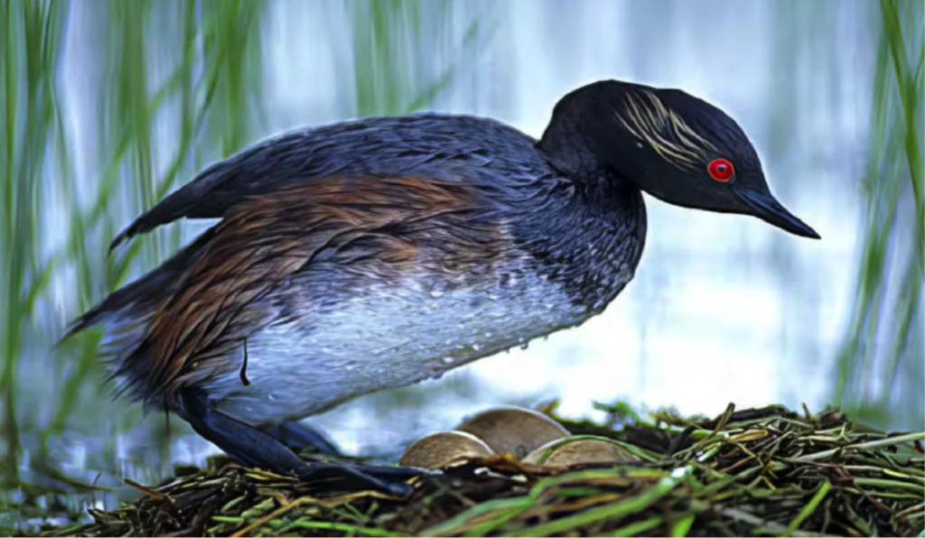 In South Africa, these grebes breed on large expanses of water with emergent vegetation and often some flooded trees. Like in the Great Crested Grebe, the male and female perform elaborate displays to each other to strengthen their bond. They utter courtship and territorial calls: a squeaky whistle and a trill. They build their nests singly or in colonies. The nest is a big heap of floating vegetation anchored to the bottom or to aquatic plants. The female lays two to four eggs but sometimes lays an egg or two in the nest of a different couple, so that nests may occasionally have up to six eggs in them. Both sexes incubate. As in the Great Crest- ed Grebe, they may cover the eggs with vegetation if they leave the nests due to a disturbance. The chicks hatch with a downy covering and open eyes. Although they can swim already, for a few days, they mostly ride around on their parents’ backs. The parents catch food and hand it to the chick’s beak-to-beak. They may also drop food items on the water surface for the chicks to pick up. This way, the chicks gradually learn to catch their own food.